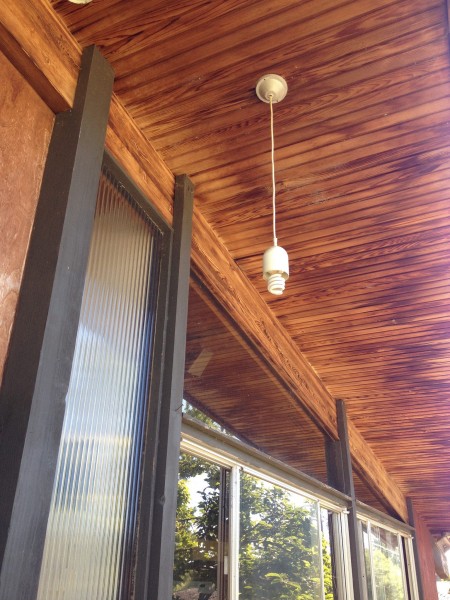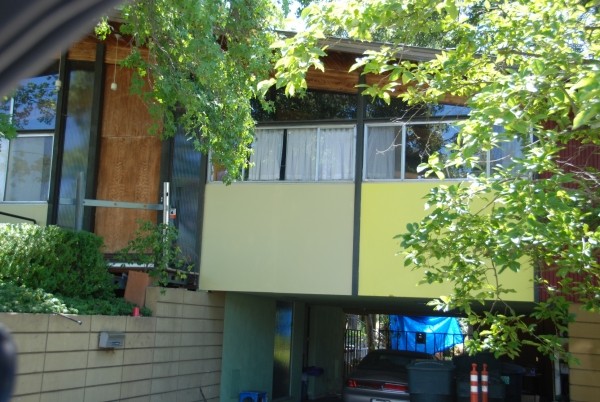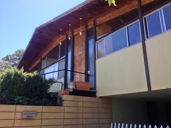 This is a house that Tony Natsoulas suggested might be a Carter Sparks (it's not). What it is though, is a wonderful residence with a drive under carport, front facade of windows, bent laminate roof beams and gorgeous 2" clear cedar tongue and groove decking.